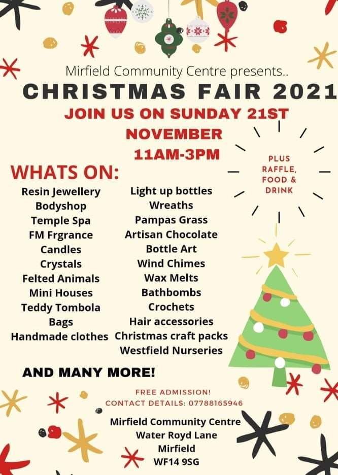 Mirfield Community Centre are hosting a Christmas Fair. Admission is FREE! Stalls include: jewellery – toiletries – candles – skin care – felted animals – mini houses – crystals – tombola – bags – handmade clothes – light up bottles – pampass grass – artisan chocolate – bottle art – wax melts – crochet goods – hair accessories – craft packs -resin goods -cards, decorations, books – wreaths – jewellery and more!