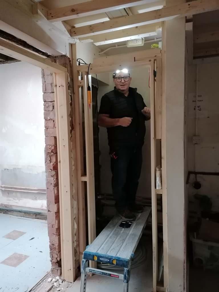 The build for the new kitchen and social area is going well and is on schedule and on budget. The first fix plumbing, joinery, and electrics have all now been completed in the new kitchen and social area. The lighting in both areas will change from the old strip lights to new modern downlights, which should make the kitchen bright and the social area feel much more comfortable. We have also had meetings to take about the colour scheme and the new built in seating.Â