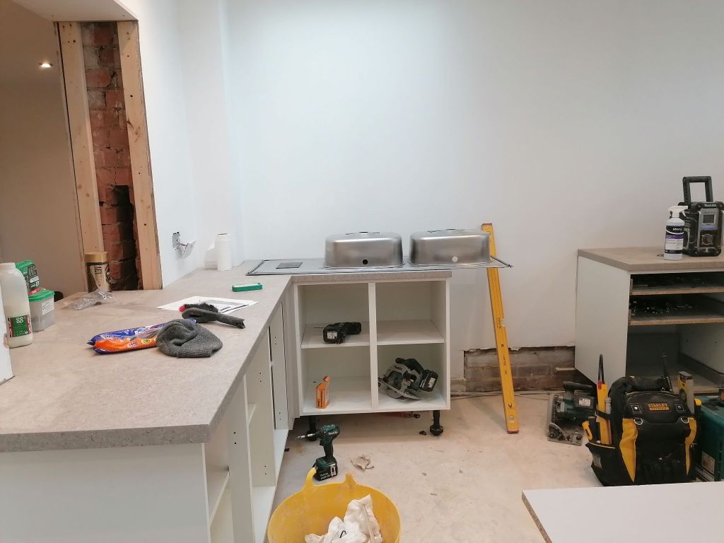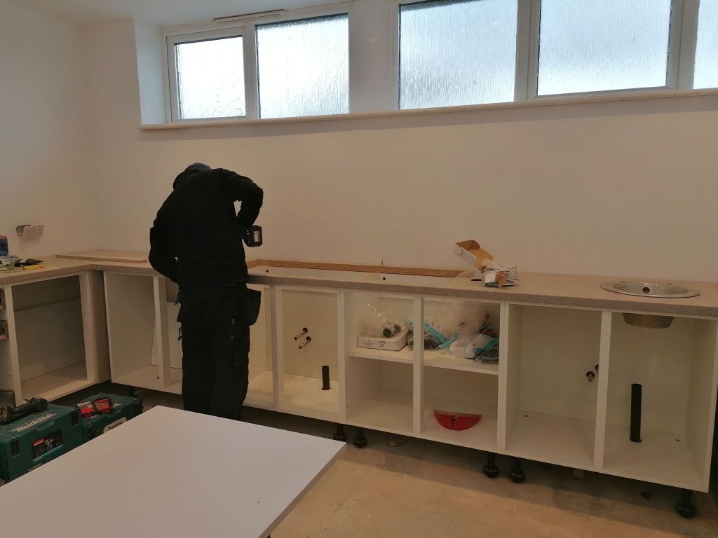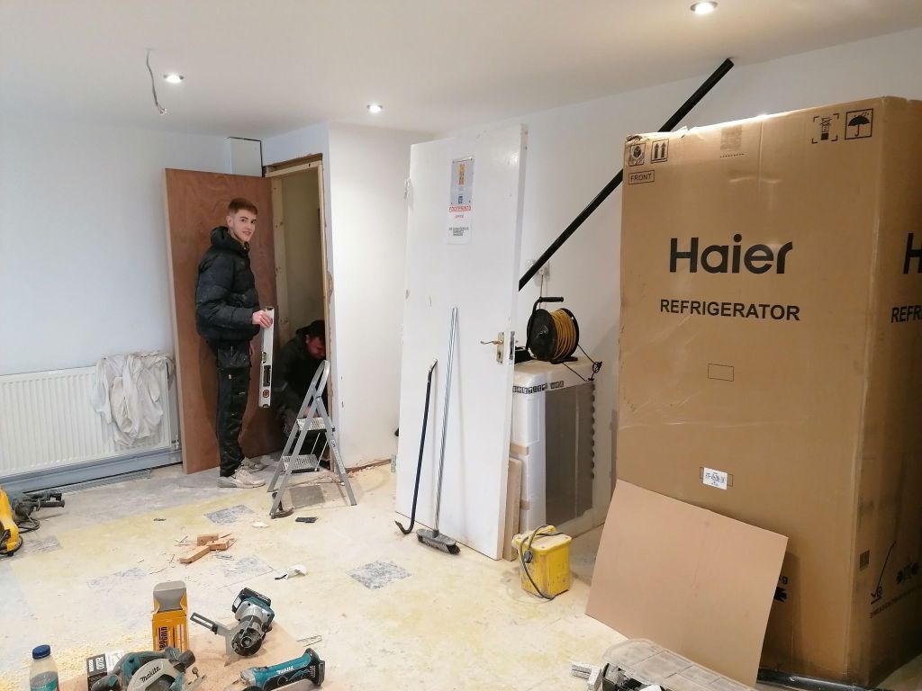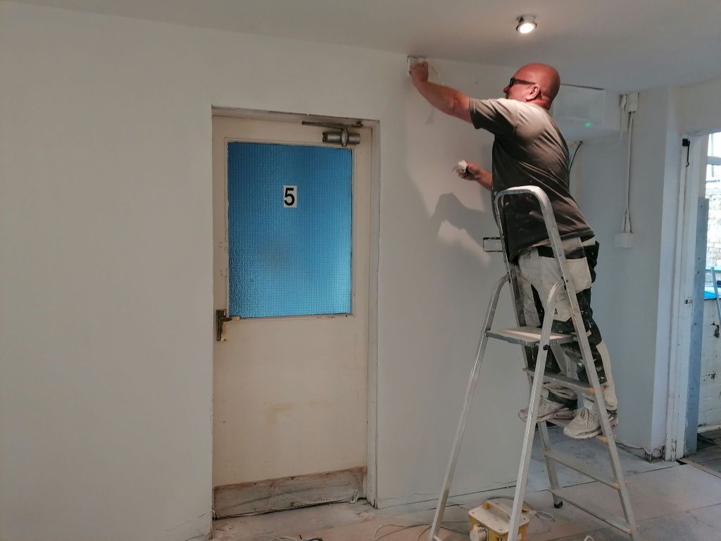 The new kitchen and social area is almost finished. The plastering has been done, first coat of undercoat paint is on, new lights are in and new doors going in. All the first fix electrics and joinery has been finished, and the lights have been changed from the old strip lighting to new modern downlights, vastly increasing the amount of light in the area. The new kitchen is now being built and should hopefully all be finished by the end of February!