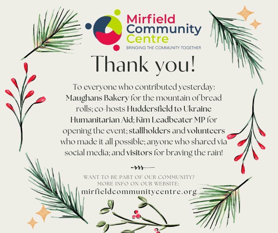 A big thank you to everyone who contributed yesterday: Maughans Bakery for the mountain of bread rolls; co-hosts Huddersfield to Ukraine Humanitarian Aid; Kim Leadbeater MP for taking time from her busy schedule to open the event and visit the stalls; to the stallholders for bringing your goods, cheer, and sales patter; to the volunteers who made it all possible, without people to set up, make food, plan the stalls, clear up, do the marketing, and more the event wouldn’t happen; a shout out to those who shared photos and tagged us on social media; and finally thanks to visitors for braving the rain and spending your money on Christmas goods and the charity stalls!